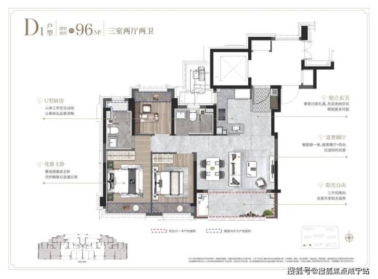 项目建面约103㎡3房同样是三开间+大横厅的布局,但尺度上更进一步。而且灵动空间更多,全屋飘窗+南向观景阳台,提升性价比的同时也增强户型对外的延展性。