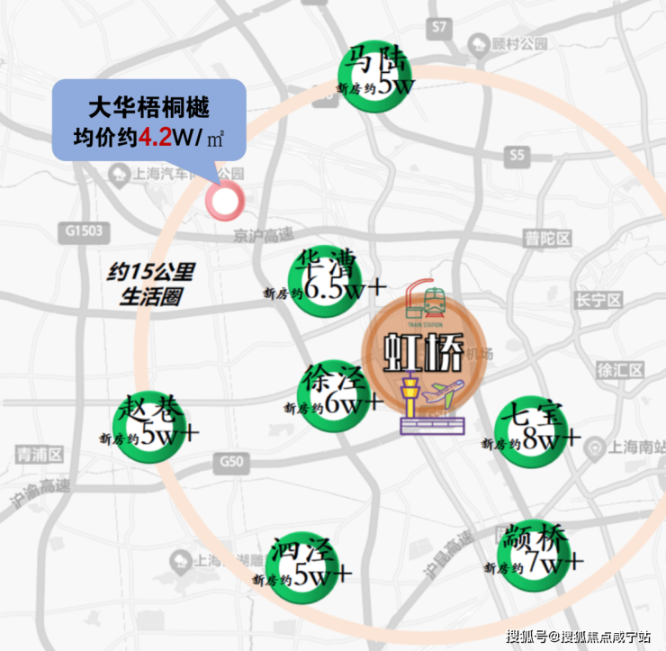 以虹桥为圆心,画一个半径约15公里的圈之后会发现。同样相距虹桥约15公里左右的马陆新盘价格基本上已经接近5w,泗泾、赵巷这些热门板块早已超过了5w,而颛桥更是达到了7w以上......「大华·梧桐樾」仅约4.2w的联动价显然更具优势。