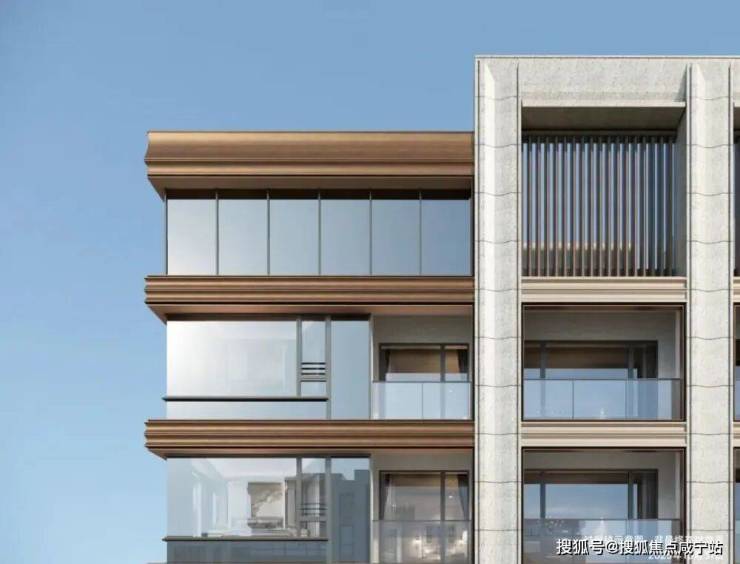 在立面打造上,项目以“石材+铝板”组合成为普陀新的颜值标杆。可视面采用古铜色金属铝板、米黄色铝板/石材,边套搭配270°大转角飘窗,从正面、侧面到背面,立面都保持精致统一的质感。
