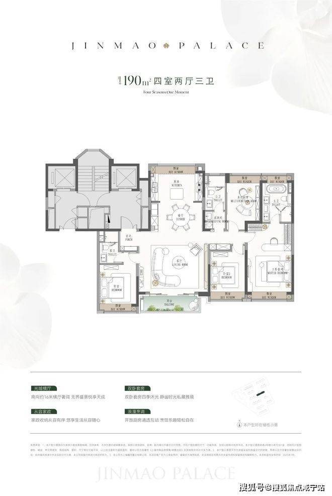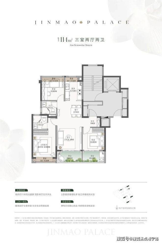 产品方面, 预计将推出建面约110-190㎡3至4房产品,四种户型的飘窗与阳台空间都比较大。110㎡户型的阳台将次卧和客厅联通;123㎡是横厅设计;140㎡足足有七个飘窗空间;185㎡各个房间的空间更上一层。