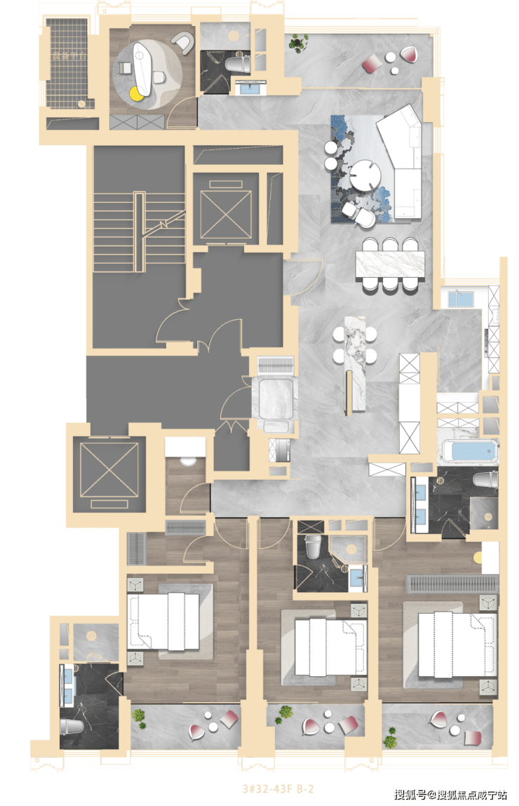 其中3#为超高层,北向可观小区绿化和苏河景观,高区可瞰三件套盛景。