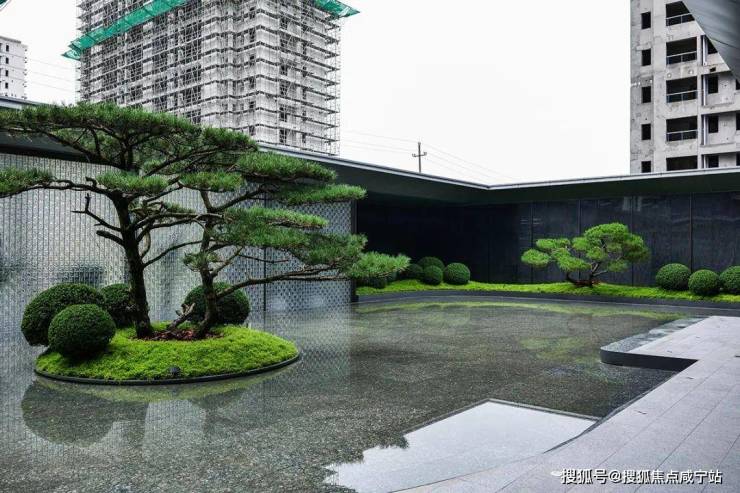 穿过宏伟的大门,一片波光粼粼的镜面水景映入眼帘。水景底部铺设着进口天然蓝钻大理石,与平静的水面相映成趣,微风拂过,水面荡起层层涟漪,仿佛将自然之美浓缩于此。水景中央及四周,四棵名贵的黑松亭亭玉立,与水景和谐共生,寓意着业主们的身体健康与事业进步。