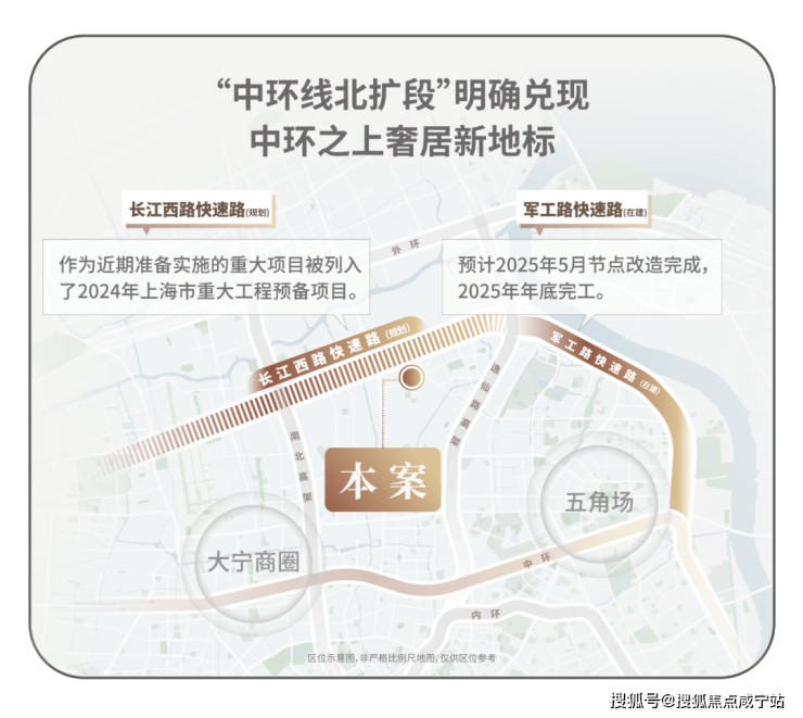 作为上海市重大工程项目,“中环北抬”通过延伸中环线北部军工路、长江西路、沪太路三条快速路的互联互通,构建一条全新的交通大动脉,进而形成一条全新的“中环”动脉路网。