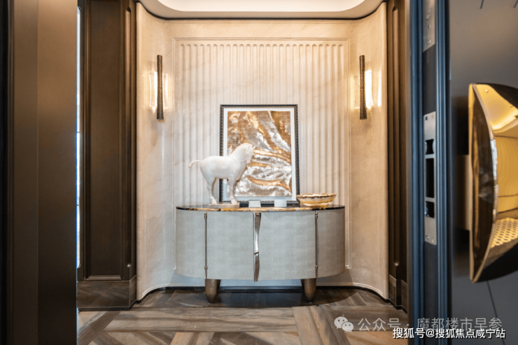 例如入户玄关铺设有“石材皇后”鱼肚印象,这种级别的奢石在很多顶豪项目中通常仅作局部镶嵌
