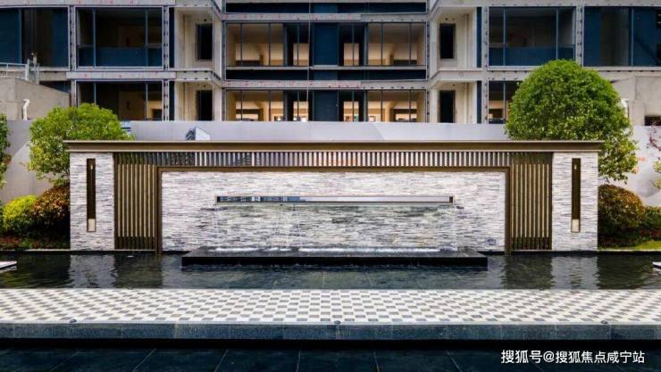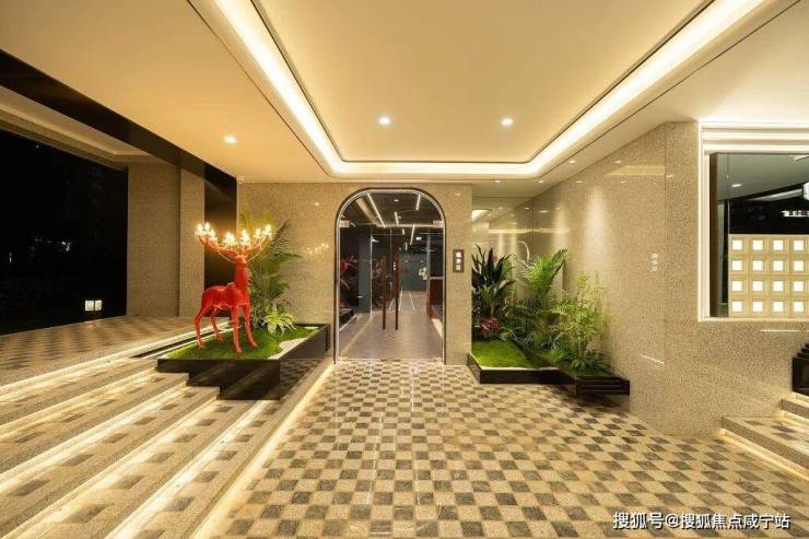 前场地面用小块石材砖铺设出回字形纹路,渲染一种高级的归家氛围。