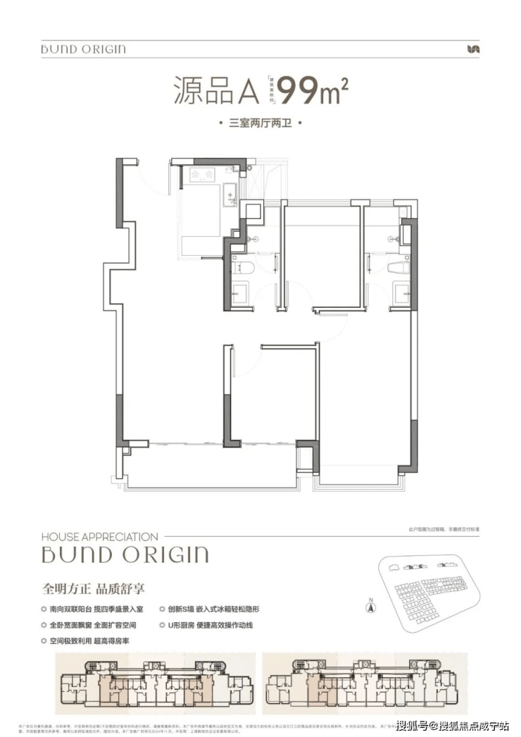 主打的99平方米三室两厅两卫户型,总价在千万级别,提供豪宅般的居住品质,性价比极高。户型设计三面朝南,拥有“四个飘窗+双联阳台”,在采光、视野、私密性和实用性方面都表现出色。客厅、餐厅与阳台一体化,空间宽敞方正,客厅与次卧相连的宽景阳台,尽显生活奢华。