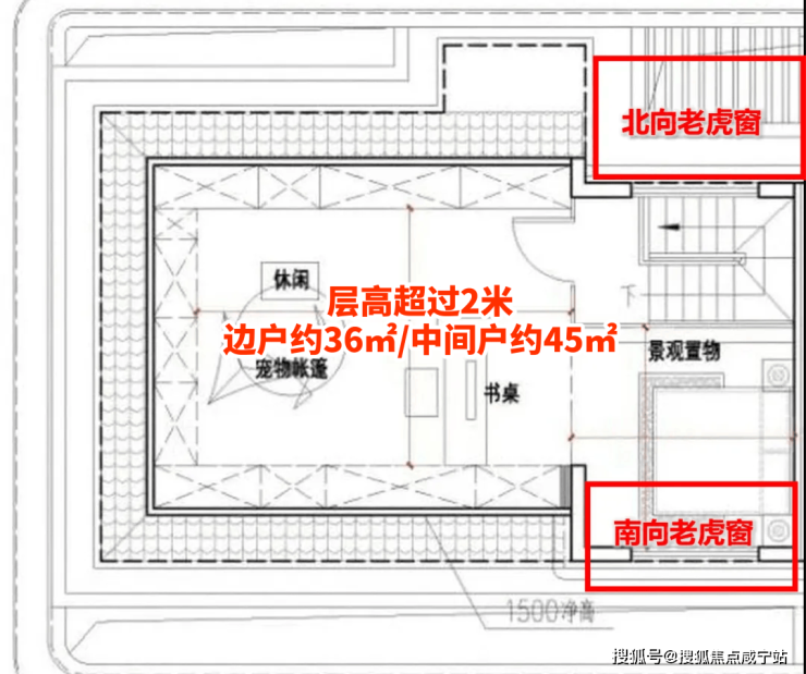 ⑥、项目的所有上叠产品,都规划了层高超过2米的灵动空间 (因屋顶造型因素,边户约36㎡,中间户约45㎡)。