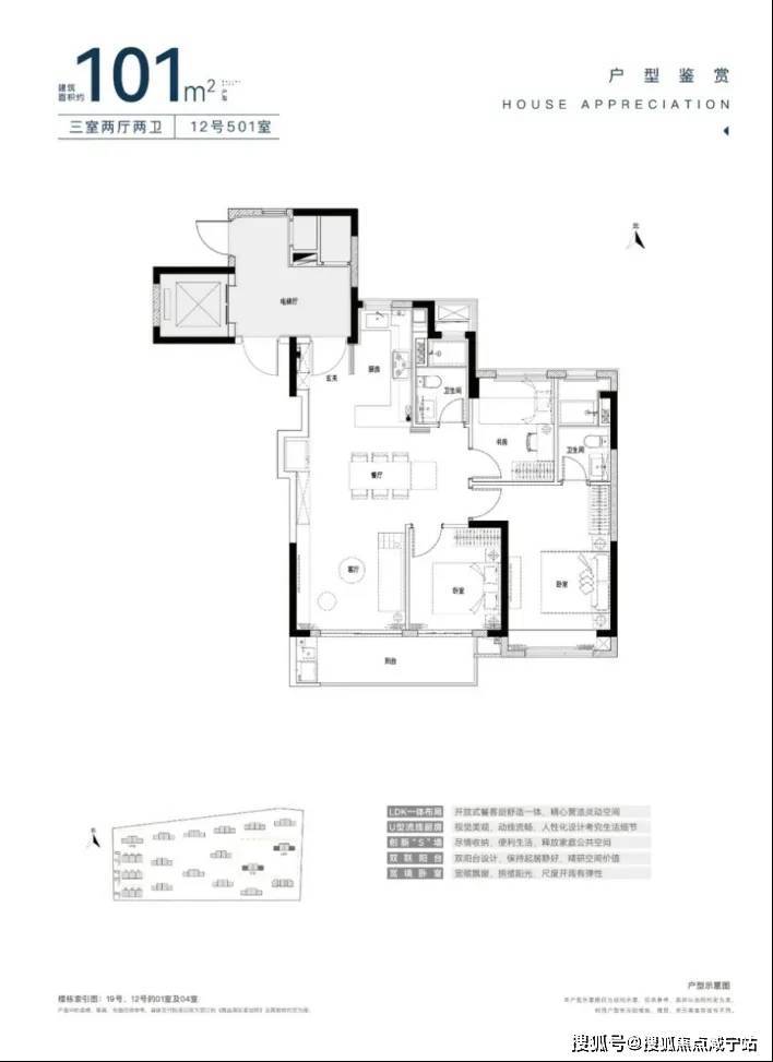 建筑面积约101㎡3房2厅2卫户型,功能性和尺度感完美结合。