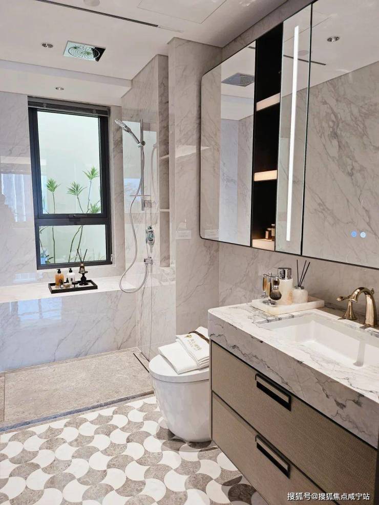 奢石台面,皮革饰面柜抽屉,侧端设置金属收纳开放格;定制镜柜,中间的透光玉石直接提升了高级感,镜柜内部配备了美妆冰箱+美妆灯条+轨道收纳!