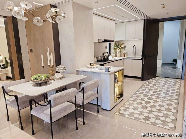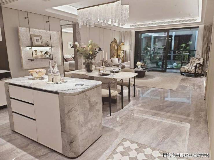 入户这座铸铝门,质感厚重;通顶玄关柜,内置消毒精灵,奢石把手+奢石台面更显海派温润气质,玄关地面都铺上了海上·清和玺的logo拼花,小小玄关做到了既实用又美观。
