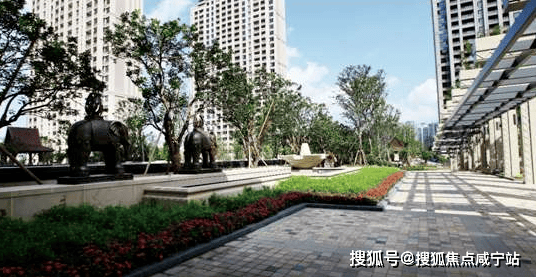 内部的景观,品尊国际也以现代东南亚景观为主,在中轴线上设置了大量的景观绿植以及雕塑、工艺灯笼、雕饰景墙等。