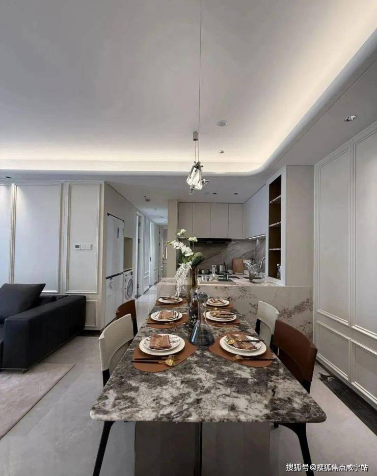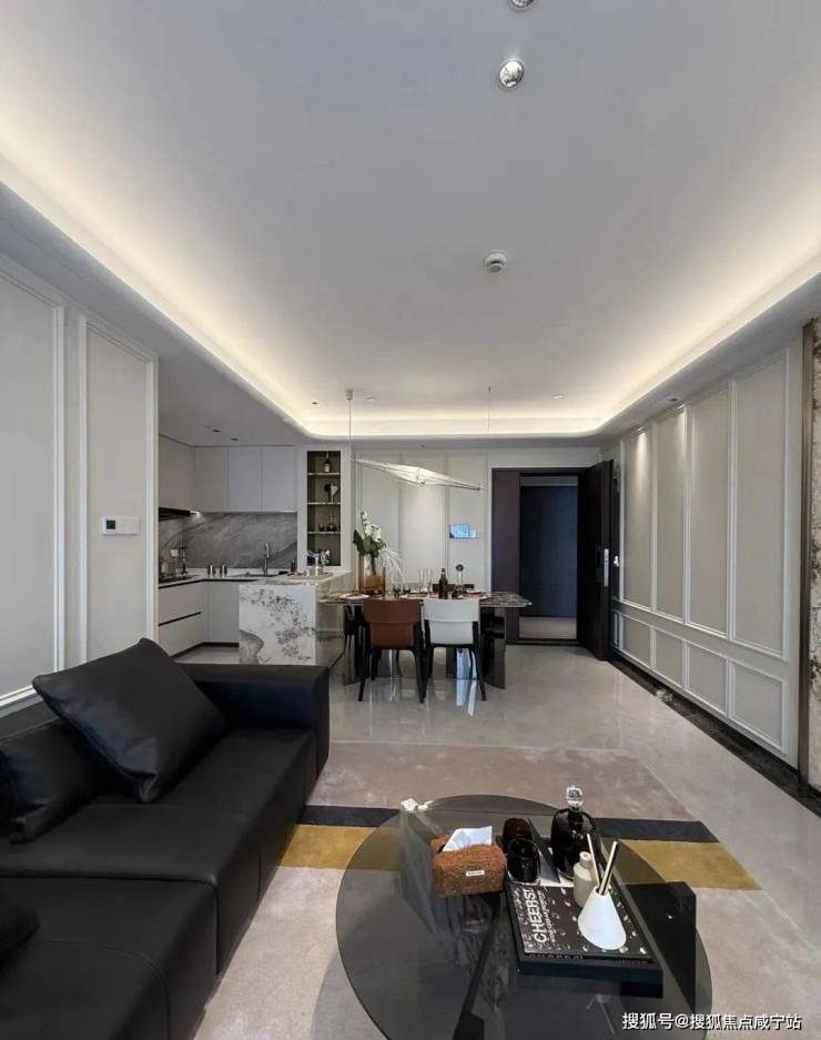 97㎡轻奢两房:餐客一体化设计延展视觉纵深,U型厨房衔接飘窗餐区,主卧套房式布局预留独立衣帽区,小户型亦显阔绰1。