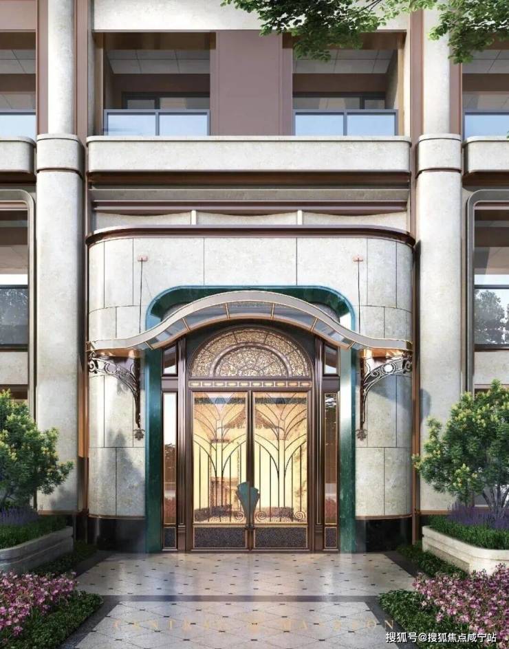 「玉兰门庭」摩登飘逸,环抱式落客前场,大师定制非遗掐丝珐琅门钹,流转温润光华,敬呈归家尊崇礼序,自此启幕生活的华贵序章。