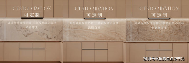 厨房背景墙可定制:背景墙为岩板铂金冰玉、波斯白玉、安第斯雪景三款可选,定制专属于你的大师厨房。