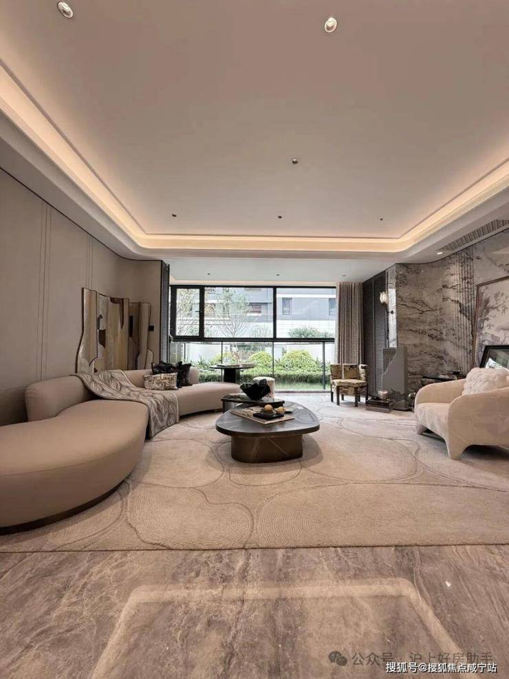 电视背景墙采用卡慕白的石材+皮革造型,弧形吊顶,相当讲究,连空调出风口的形状都打造为海上·清和玺logo山茶花的形状~~三大件为大金(或同等档次)中央空调和地暖,新风系统为百朗(或同等档次),南向阔景阳台,采光视野一级棒!
