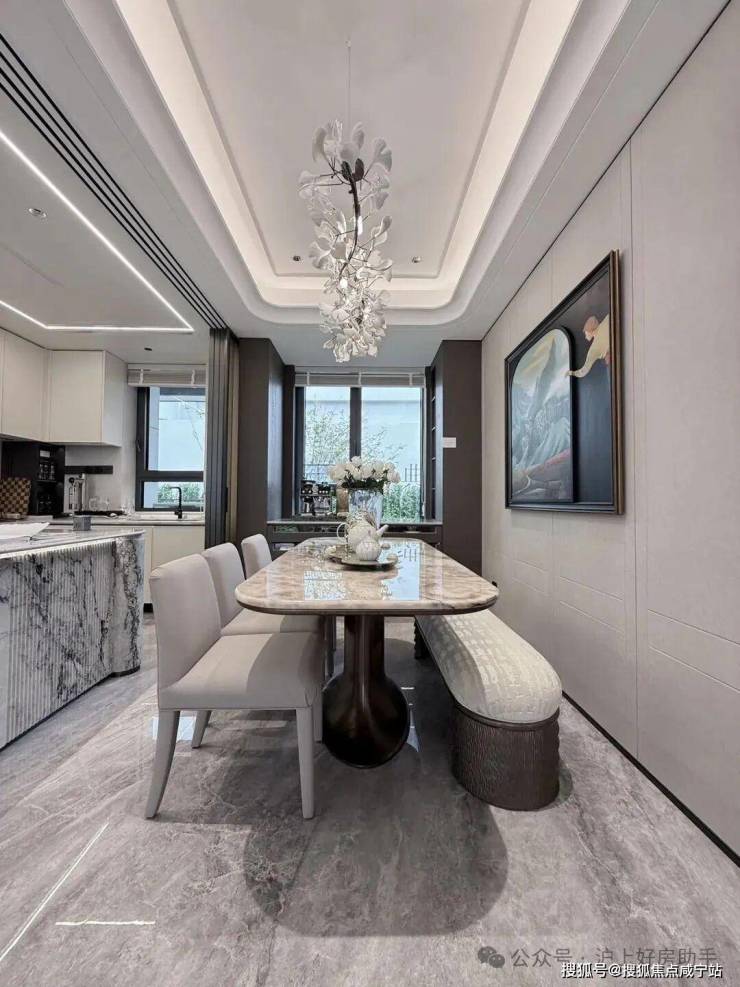 入户这座铸铝门,质感厚重;通顶玄关柜,内置消毒精灵,奢石把手+奢石台面更显海派温润气质,玄关地面都铺上了海上·清和玺的logo拼花,小小玄关做到了既实用又美观。