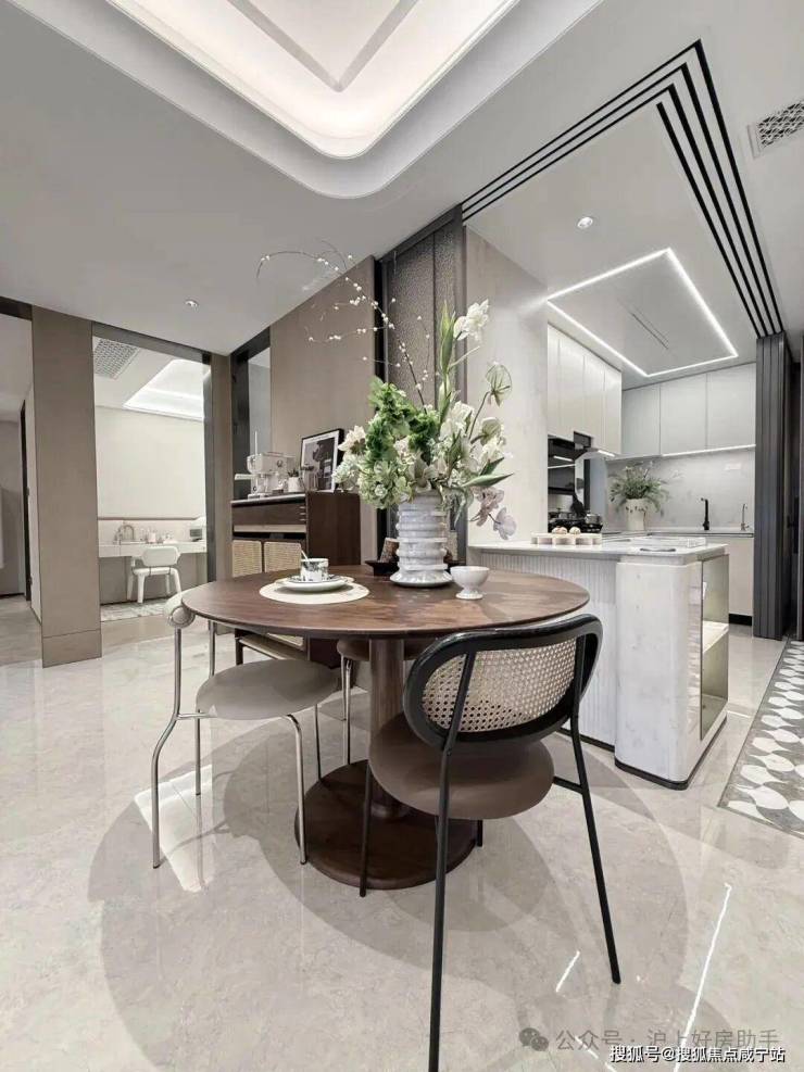 进门可以看到经典的S墙设计,L型厨房操作台面,也是暗藏不少细节——玻璃移门采用完美系列夹丝玻璃+金属造型边框,顶部配置线性凉霸+LED嵌入式回形灯带+筒灯,灶台后侧采用大面积岩板铺设,方便清洁的同时显得厨房更加大气。