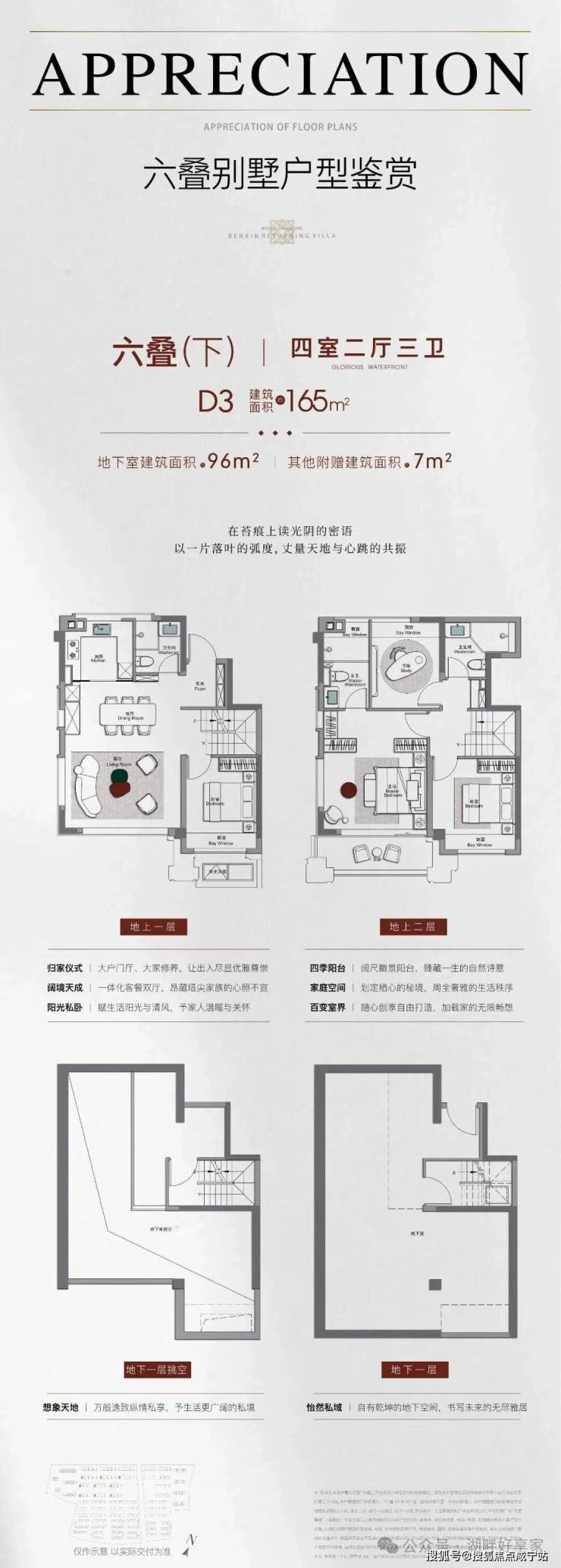 合院:建面约190㎡三室两厅三卫、约210-230㎡四室两厅三卫/四卫,附赠地下室+露台,总价预计约2000万;3层地上+地下室设计。