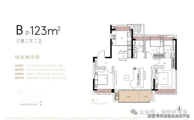 洋房:建面约123㎡小高层三房飞机户型+洋房设计,搭配双阳台+多飘窗(边套含双270°转角飘窗),层高约3.15米;客厅设计更具选择:竖厅面宽约4.5米,宽敞通透;横厅面宽达约6.1米,多出灵动空间可作开放式书房、茶室,适配多元生活场景。总价753万起。