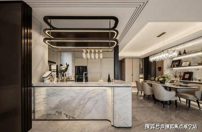 厨房与餐厅打造半开放式格局,隐形推拉门既可以隔绝烟火,平时收入墙内让空间一体、开阔大气。
