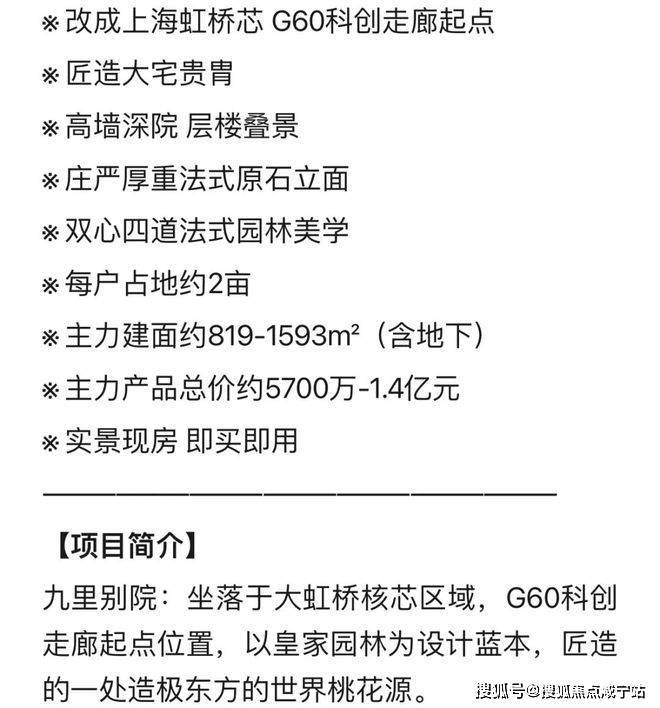 - 上海·九里别院 —— 汇贤阁 现已瞩目登场,作为上海虹桥芯G60科创走廊的起点,它是一处匠心独运的贵族府邸,融合高墙深院与层楼叠景之韵,彰显出法式原石的庄严与厚重。这片园区拥有双心四道法式园林美学,每一户占地约2亩,主力建筑面积约在819-1593m²(含地下),售价约为5700万至1.4亿元。更有实景现房,让您即买即用,即刻体验尊贵生活。