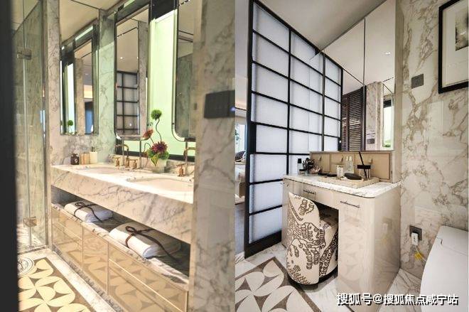 另外,在营销展示里还有颇多细节,有的是需要额外花钱的,有的是不怎么需要花钱的,但都体现了设计条线的用心。比如:1)檐口工艺,2)入户家徽,3)地面材质通铺至阳台,4)阳台的斜窗,5)主卫的飘窗梳妆,6)踢脚柜,7)顶柜的镜子,上述这些都是只在这个项目里才能看见的。