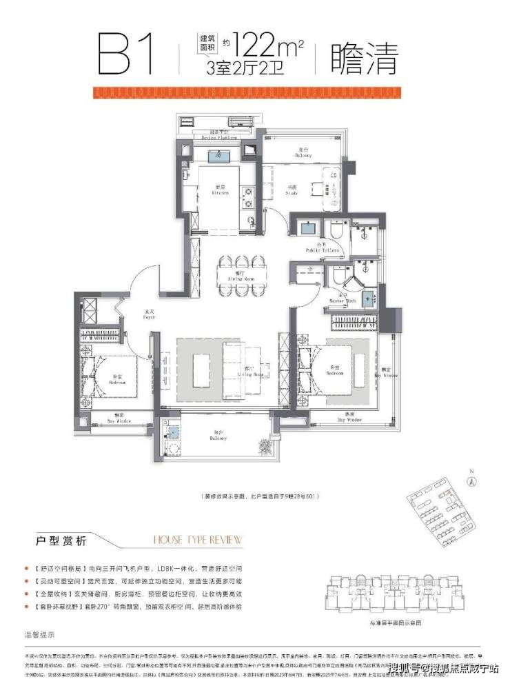 建面约112㎡3房,独立玄关入户,南向双阳台,如果南次卧打通阳台,那么就可以得到一个媲美主卧尺度的南次卧;边套主卧带L型转角飘窗。