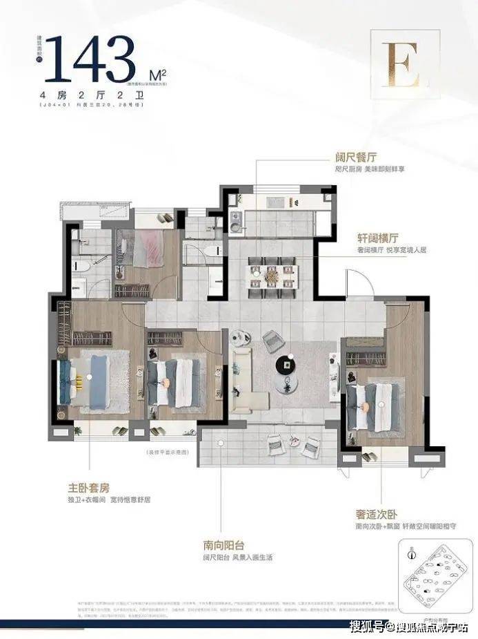 四间卧室中的三间聚合排布,形成独立的居住静区,另一间南向卧室独立处于客厅另一侧,可用于老人、青少年居所,让不同生活习惯的家人都能静享私密生活。而主卧套房的设计,空间感十足,配备步入式衣帽间,独立卫生间,双台盆规制,南北通透的设计,提升生活的舒适度,打造奢适居住体验。