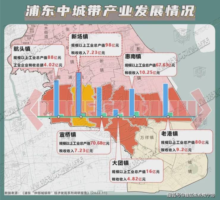 这是浦东“链接东西,勾连南北”的枢纽带,是提升浦东新区整体发展质量的关键。这条城镇发展带上,遍布着航头、宣桥、大团、惠南等浦东已发展醇熟的城镇区域,但如果我们仔细对比这些城镇的规模以上工业产业及税收收入,不难发现新场的发展能级具有明显优势。(数据来源:《浦东“中部城镇带”经济发展系列调研报告》2022.11)