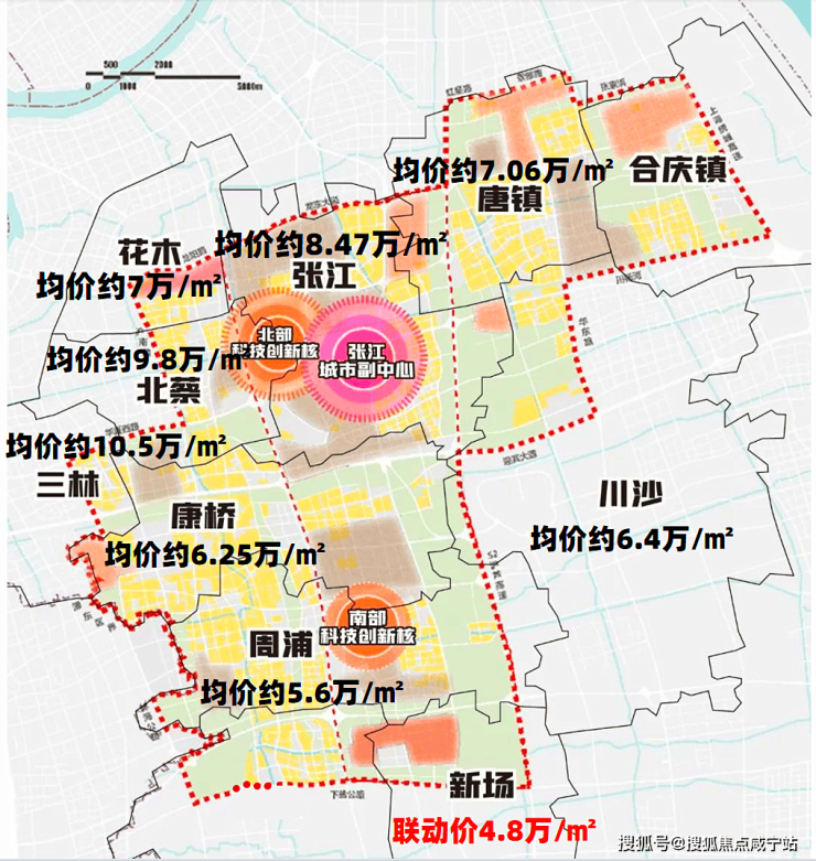 从新场站出发,6站即可换乘2号线后,1站即达张江高科。唐镇目前4站可到达张江高科,它的联动价是7万。新场目前新房联动价4.8万,价格整整少了近一半。于是,新场等来了招商象屿·星耀翠湾。