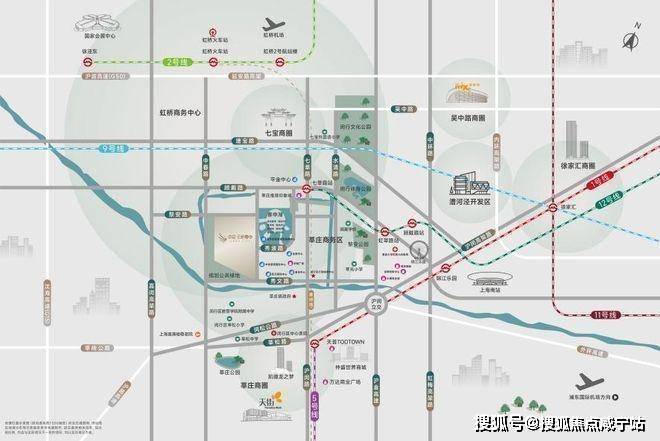 中企云启春申位于闵行莘庄商务区核心,秀涟路与秀波路交汇处,属于上海“闵行主城功能核心区”重点规划板块。最打动我的是其交通配置:直线距离地铁12号线七莘路站约700米,步行10分钟可达,未来嘉闵线(预计2027年开通)也将在此交汇,可直达虹桥枢纽、漕河泾、徐汇滨江等核心区域。这种“双轨交”配置在外环沿线新盘中极为稀缺,尤其适合在徐家汇、漕河泾上班的通勤族。