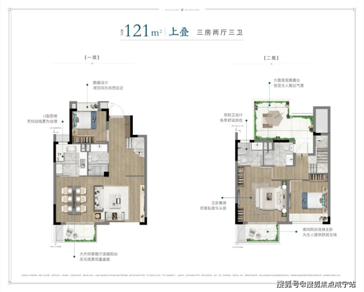 户型特点:所有卧室均带飘窗,二楼主卧带宽面阳台,这样的设计让整个户型拥有极为出彩的视野以及采光。