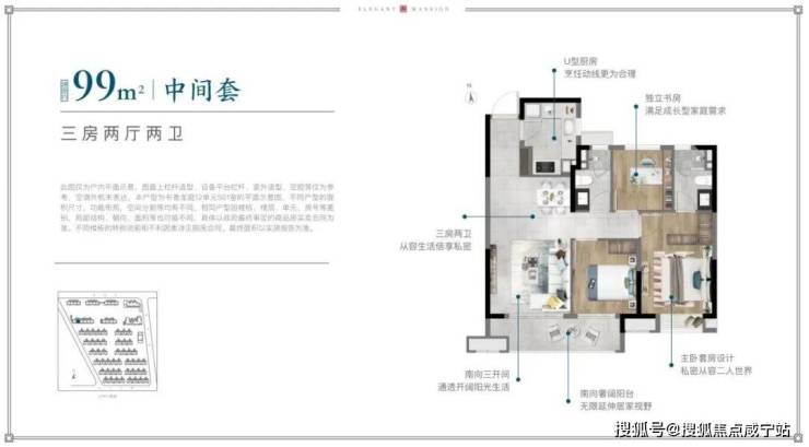 户型特点:三开间朝南,阳台面宽可达约5.3米,【中建·玖里书香】售楼处电话:400-960-1656横跨客厅和南向次卧,大幅度增加南向采光面。来客、家务、居住动线合理布局,互不干扰。双明卫设计,保证生活品质与独立私密。主卧套房,配置独卫、衣帽间,打造面面俱到的寝居空间。