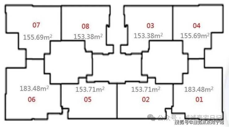 该栋分为A/B单元,每个单元有四个单位:包含3套153㎡及1套183㎡,平面布局与住宅相似。