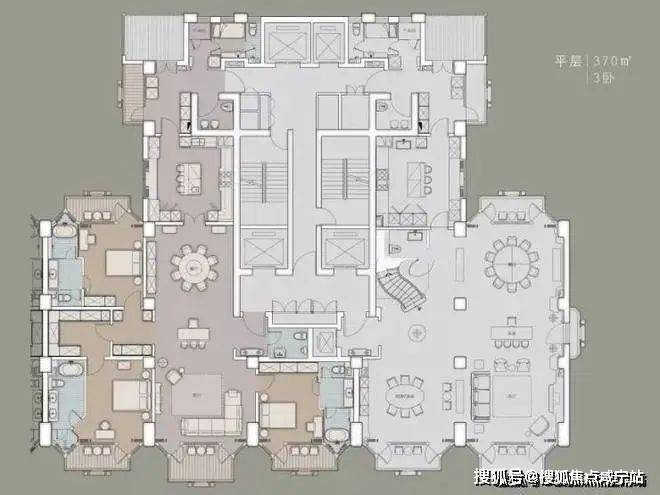 以2号楼为例(预计首批即将推出的楼栋):左侧370㎡平层,除了灰色点块位置的承重墙,其他墙体均可移动,户型能重新定制,几房几厅业主说了算,而且该户型还有5个阳台!