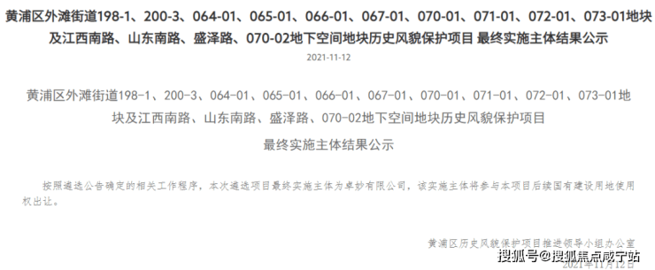 回顾下金陵东路项目的拿地过程:2021年11月12日,黄浦区外滩街道198-1、200-3、064-01、065-01、066-01、067-01、070-01、071-01、072-01、073-01地块及江西南路、山东南路、盛泽路、070-02地下空间地块历史风貌保护项目实施主体公开遴选入围结果公示。