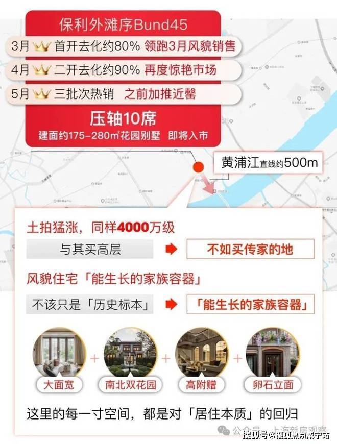 杨浦滨江风貌带全新供应,约500米滨江+臻稀风貌+超级花园,保利·外滩序BUND45在首开去化约80%,领跑3月全上海风貌销售榜后,保利·外滩序Bund45风貌于4月再度入市,去化约90%。