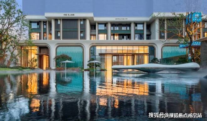 浮光池院水院会客厅,现已实景呈现,水景中央的艺术小品,如一滴水在湖面晕开,泛起阵阵涟漪。