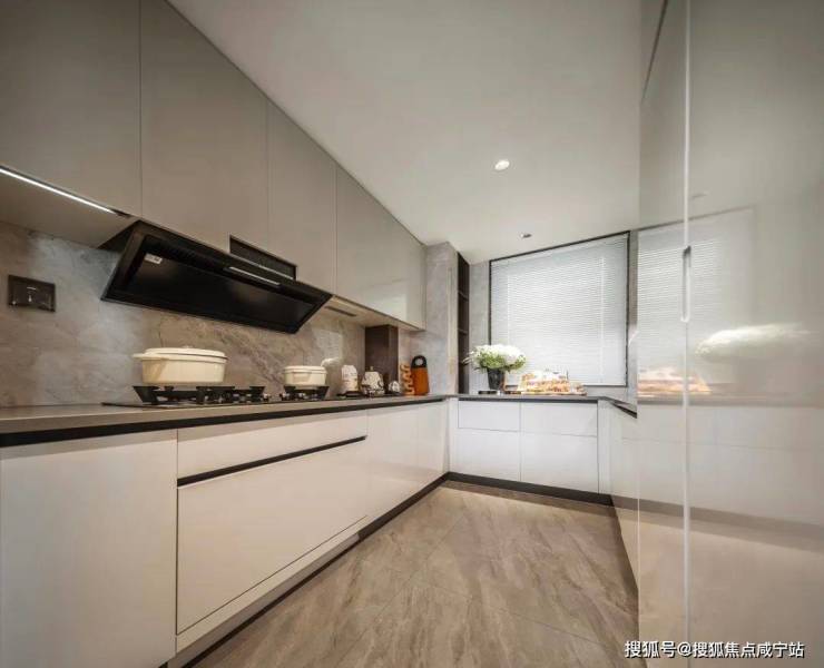 再来看看厨房部分,U型厨房操作动线流畅,厨房全超一线高端品牌,博世燃气灶、油烟机、洗碗机三件套;摩恩水槽、抽拉式水龙头都为大家配齐。