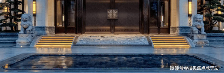 这个入户台阶,很王府宫殿的气势,中间御道以鲤鱼跃龙门为浮雕,象征着业主可以中举、升官,平步青云。门前的两樽镇宅石狮,是复刻北京故宫太和殿门口那对铜狮子的造型,左雄右雌,一个寓意财源滚滚,一个寓意子孙满堂,谁看了都会心动的。