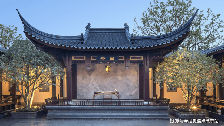 进入大门正入眼帘的就是这座琴台,据说取自古猗园中的微音阁。据介绍这个建筑屋顶的含义比高,采用的是中国皇家“歇山顶”,因为拥有九条屋脊,所以又称九脊顶。因此又蕴涵了九五至尊的意思,所以成为皇家的专用设计。在古代这样形制的屋顶是最高级别的。