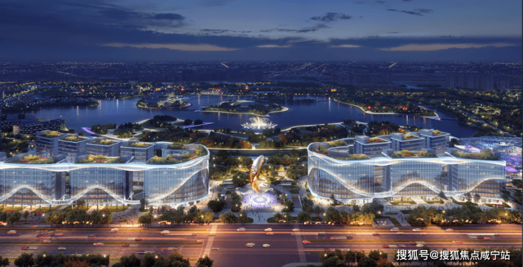 项目建筑设计汲取“双龙戏珠”的东方美学灵感,结合流线型的建筑形态,从空中俯瞰宛如两条金鱼跃入湖面。外立面采用360度全玻璃幕墙设计,简洁大气,呈现出国际化高端商务界面。