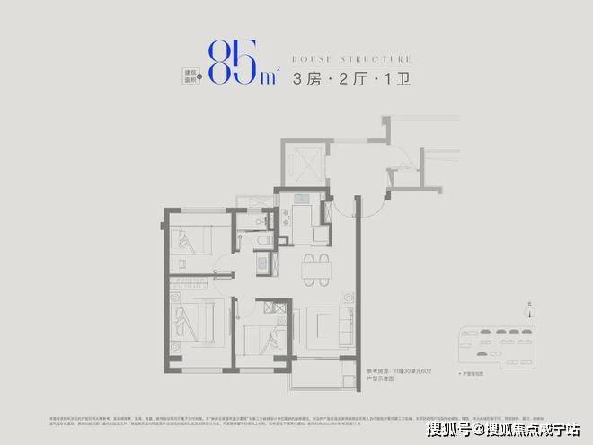 建面约85㎡3房1卫,做到三开间朝南+全卧室带飘窗+卫生间干湿分离+动静分离,非常紧凑的小3房。