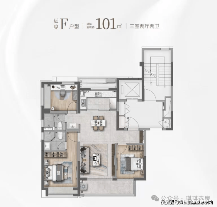 建面约101㎡的F和G户型都是市面上备受认可的飞机经典款户型。