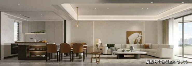 客餐厨阳台一体化,放大社交空间尺度;同时厨房可开可合,下厨时也能和家人情感互动。