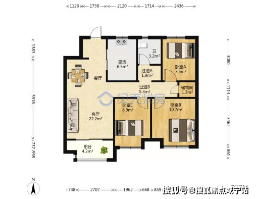 主卧面宽约3.6m,次卧面宽约3.3m,就连北侧房间面宽都做到了3.2m,这意味着该户型的三个房间,每个房间都拥有舒适卧室的空间尺度。