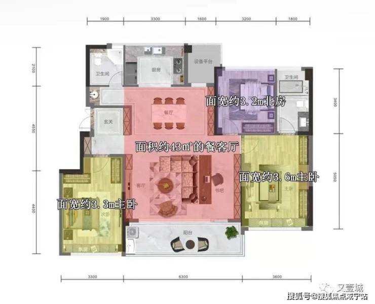 把大量面积留给餐客厅区域,即使不算阳台和厨房,总面积也达到了约43㎡,堪比180㎡+级户型;