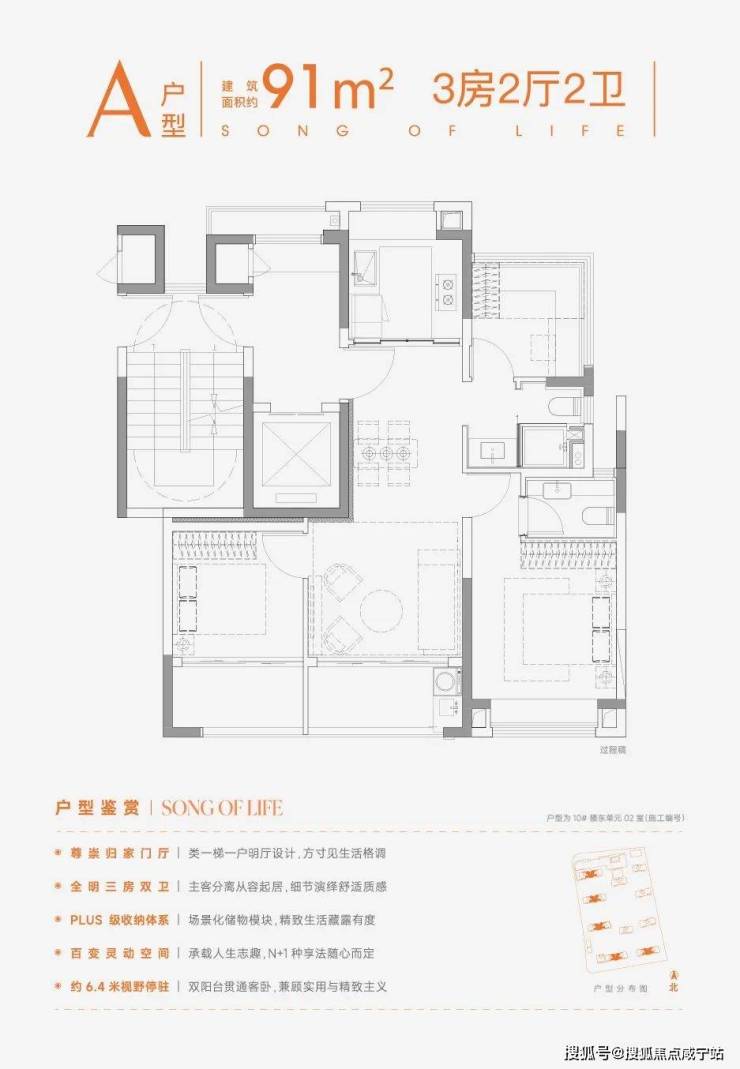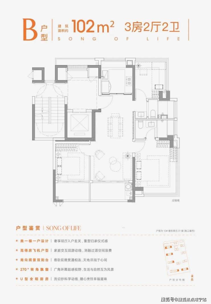 相比建面约91㎡小空间大舒适,同户型布局建面约102㎡不仅仅是面积的增加,更是生活方式的升级,高得房飞机户型,减少过道浪费,餐厅位置比常规户型更阔绰,小家庭聚餐其乐融融;双卫三段式带飘窗配置,空间划分清晰,互不干扰,让洗漱也能沐浴在阳光之下;南北双270°环幕视野,不仅采光通风更优,风光自然入怀,为休憩时光添了几分诗意与惬意。
