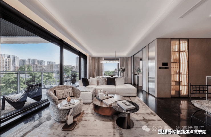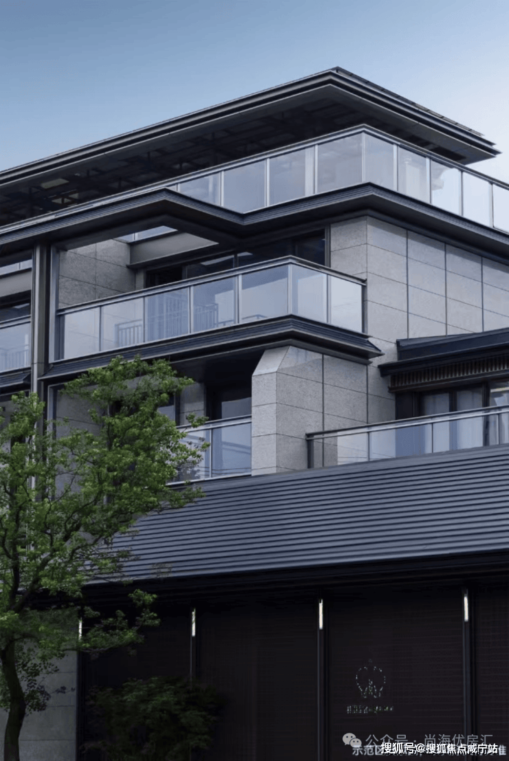 建筑立面取意“瘦金体”笔韵,鎏金铝板与天然石材辉映,搭配全景落地窗,将四时景致与流云光影纳入室内.