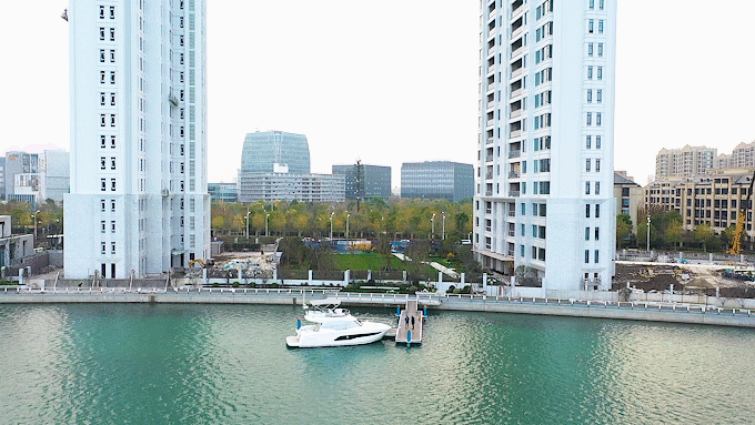 每一排别墅前都有一条渠道,引入水系,可!以!停!游!艇!